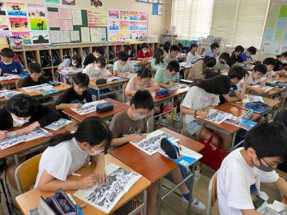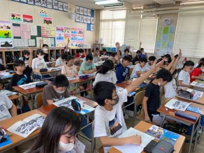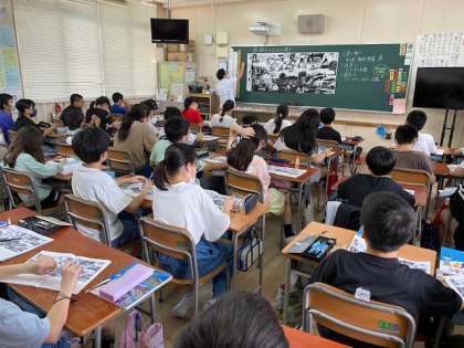 例えば縄文時代であれば、黒板に大きく張り出された生活の様子を描いた絵を見て、気づいたことを見つけて話し合っていきます。