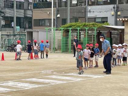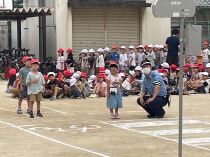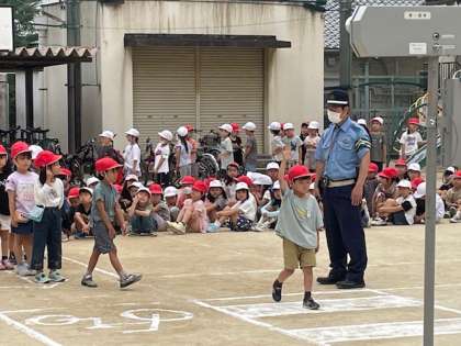 おまわりさんの指導のもと、交差点や横断歩道で注意すること、道路を通っている通っているときに気をつけないといけないことなど、実際歩きながら確認をしていました。