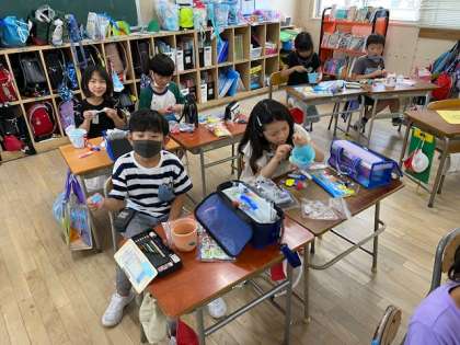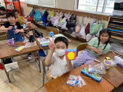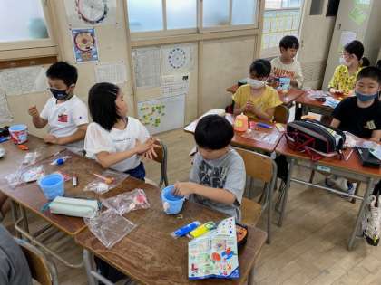 3年生の図工では、カップにカラフルな粘土を使って、コップや植木鉢、小物入れなどを作っていました。