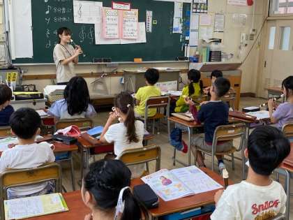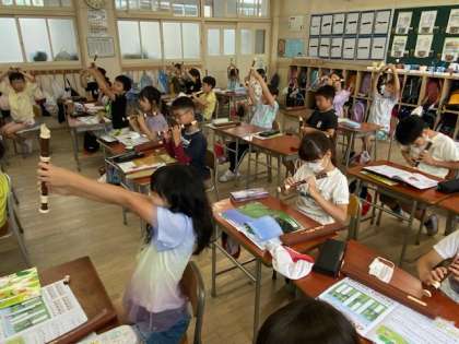 基本となるタンギングを使って、先生が先に吹くリズムを子どもたちが真似て吹いていきます。