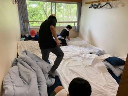 部屋では、ベッドメイキングを行っています。手際よくやれている班もあれば四苦八苦しているような班もありました。