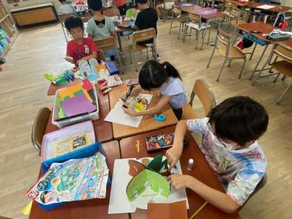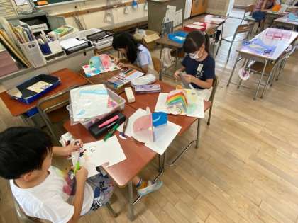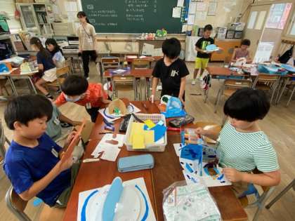 くるくると回転することを生かして作っていくのですが、子どもたちは自分の創造力を発揮し、それぞれの作品を仕上げていました。