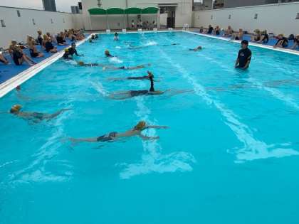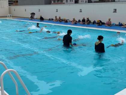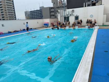 今日の4年生のプール水泳は、前半はプールの短い方を使ってクロールの練習をしました。蹴伸びをしてできるだけ水をかく回数を少なくしようと取り組んでいました。