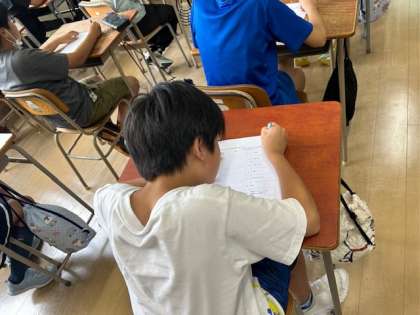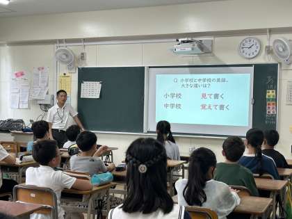 写真は、い組は理科、ろ組は英語の授業を受けている様子です。子どもたちは、中学校の授業の雰囲気だけでなく、先生の話し方や机の高さなど小学校の違いを色々と感じていました。