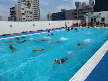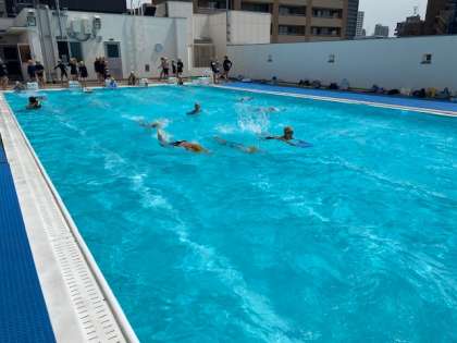 4年生のプール水泳では、25メートルをクロールで泳ぐことを目標に、プールの縦の長さを使って泳いでいました。
