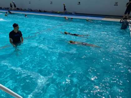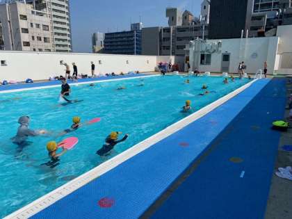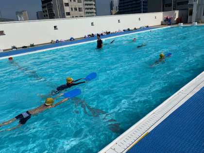 苦手意識の高い子たちは、ビート板を使ってバタ足に取り組んでいたり、顔をつけて息をはいたり、それぞれのポイントを意識して取り組んでいました。
