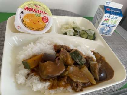 夏野菜のカレーライス、キャベツときゅうりのサラダ、みかんゼリー