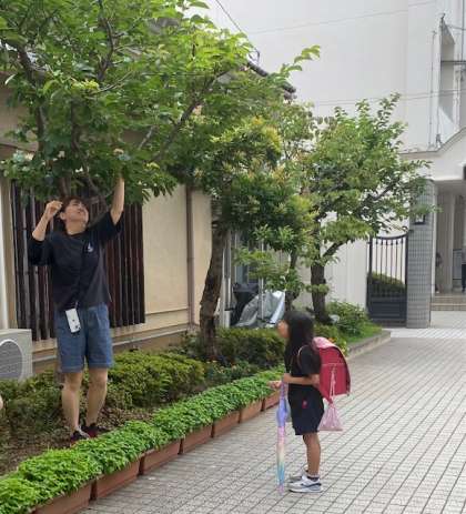 今日も学校前の木に止まっていた蝉の抜け殻を取ってもらうシーンが見られました(^^)