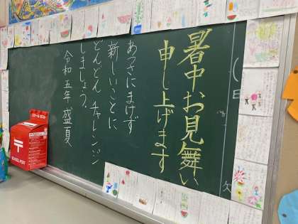 教室の後ろには、先日書いた暑中見舞の葉書が貼ってありました(^^)