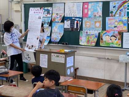 1年生の教室をのぞいてみると、担任の先生が子どもたちから提出された絵を黒板いっぱいに貼り出していました。