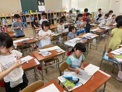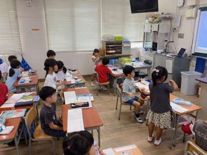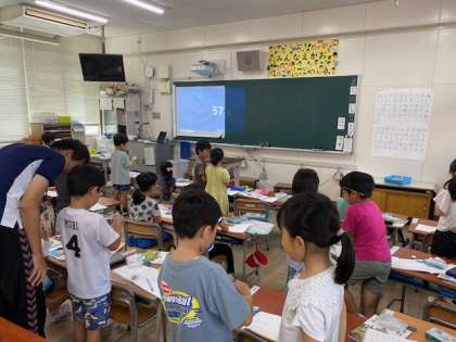 1年生の算数では、計算カードを使ってタイムを計っていました。計算してはカードをめくり次のカードの計算をします。最初から最後まで終えるのにどれだけかかるか、自分の記録を見ていきます。