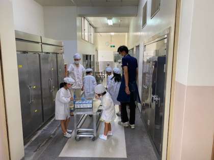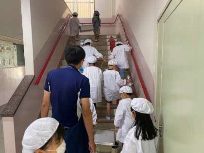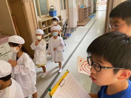 今日から2学期の給食が始まりました。給食室の前に行ってみると、早速1年生が給食を取りに来ていました。給食委員会の子たちのチェックの目も光っています。