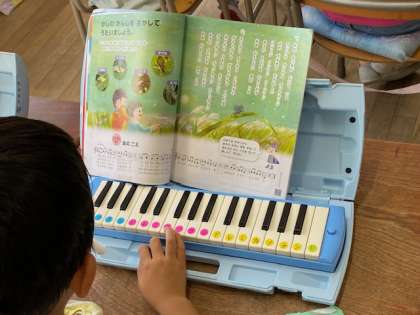 2年生の音楽では、『ぷっかりくじら』『虫のこえ』などを歌ったり鍵盤ハーモニカで演奏したりしました。