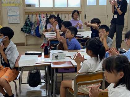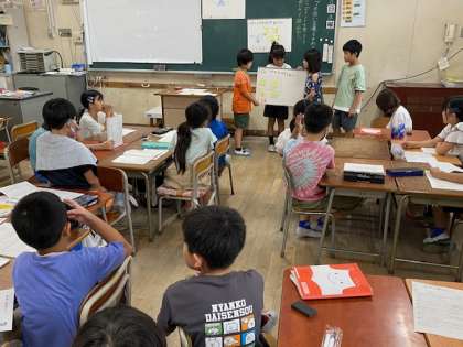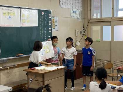 話し合った結果を前に出てきて、みんなに伝えます。グループで出てきた意見の紹介をして、その中で何を選択したのかを説明する事は大変難しいことですが、このような実践を重ねることで話し方・伝え方が上手になっていくように感じます。