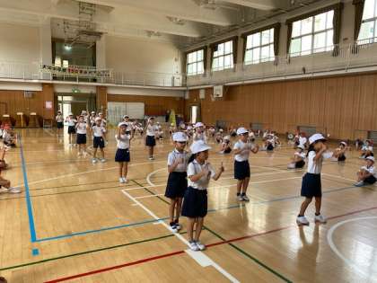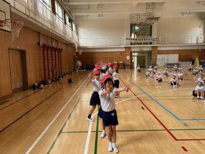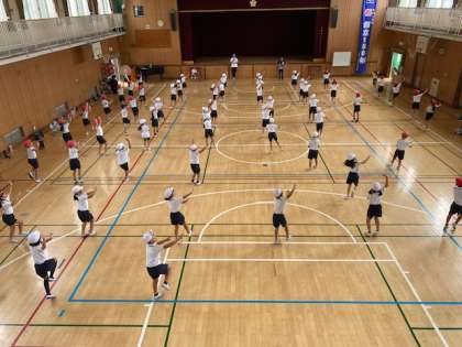 これまで、各教室で音楽に合わせて練習してきましたが、今日は学年で合わせるところを中心に取り組んでいました。