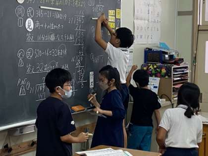 4年生の算数では、3桁わる2桁の計算に取り組んでいました。これまで学習してきたこととは言え、商を見立てることはなかなか難しいことで、大きなハードルです。