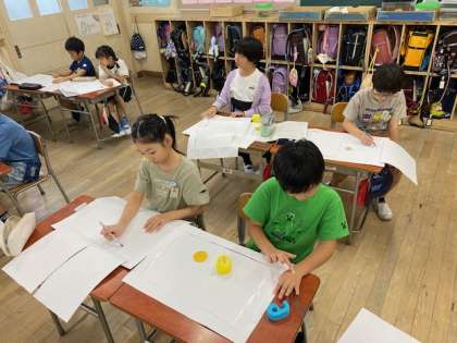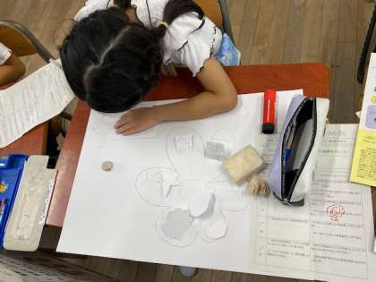 3年生の図工では『ひらいて広がるふしぎなせかい』の続きをしていました。下がきもずいぶん完成に近づいている子が多く見受けられました。