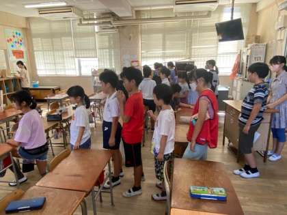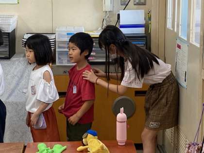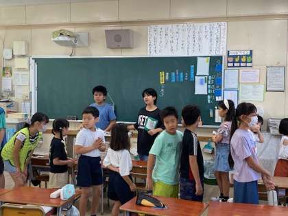 今日のなかよし集会は、伝言ゲームです。例えば『いか』など、背中にひらがなで言葉を指で書きます。それを伝えていきます。