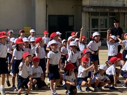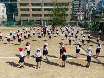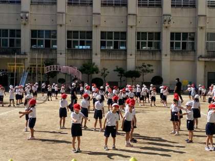 1年生は、今日から時々2年生と合同で体育をおこないます。運動場で自分の立ち位置を覚えつつ、これまで練習してきたダンスを2年生と一緒に踊りました。