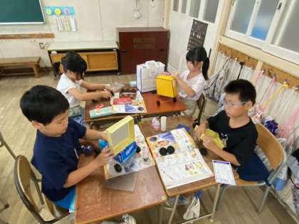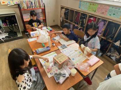 2年生の生活科では、お家から持ってきた箱や飲み物のあき容器などを活かして、おもちゃ作りにチャレンジしていました。
