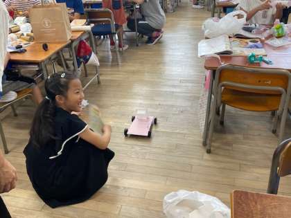 まずは、沢山の材料を前に、どんなおもちゃを作るのか考えに考えていた子もいました。中には、風を受けて走る車を作る子がいたり、トイレットペーパーの芯の中に飲み物のあき容器を入れてロケットのように飛ばす子がいたりと、子どもらしい発想がたくさん飛び出していました。