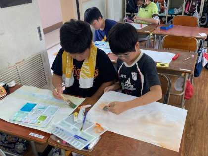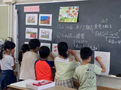 4年生の図工では『彼岸花のある風景』と題した絵を描いていました。今年は特に暑い日が続いていますが、9月23日は秋分の日、秋のお彼岸に当たります。『暑さ寒さも彼岸まで』ー子どもたちの描く絵が、秋を運んでくれたらいいなと思います。とても彼岸花が鮮やかな色で描かれていました(^^)