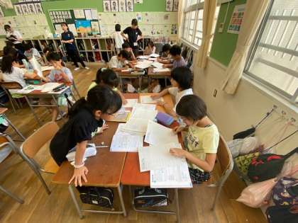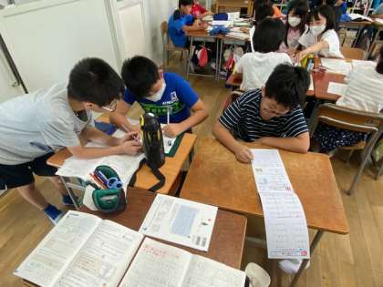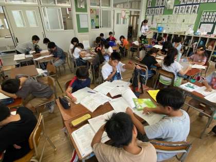 5年生の算数では、『約数、公約数、最大公約数について理解する』という課題が与えられ、グループ学習に取り組んでいました。グループ学習のルールは『答えは教えない』。鉛筆が止まっている子にヒントを与え、再び鉛筆が動き出す場面もありました。