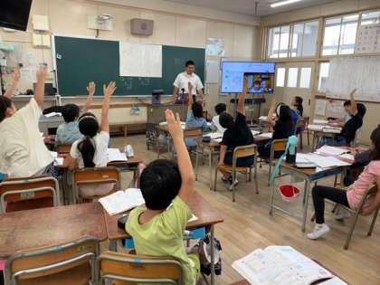 かけ算の筆算は初めて学習するので、みんなで一緒に手順を確認しました。