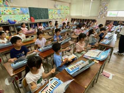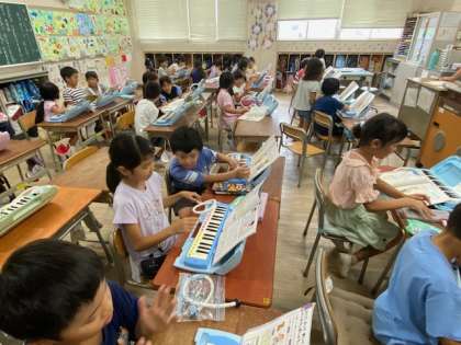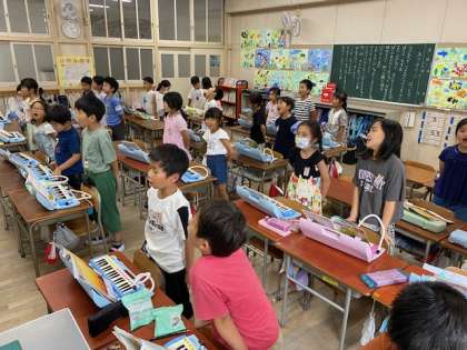 2年生の音楽では、大江小学校の校歌や『いるかはざんぶらこ』を歌ったあと、音符や休符の長さと同じ長さだけ手を叩いたり握ったりするリズム打ちをしました。