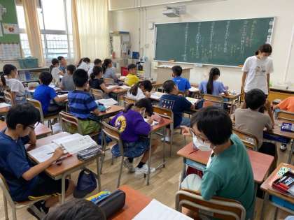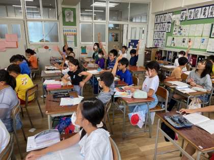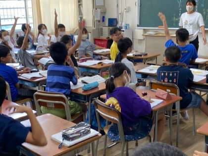 目上の人であり身近な人として、担任の先生や校長先生などが挙がると、子どもたちはとても楽しそうに与えられた例文を尊敬語や謙譲語に変えていました。