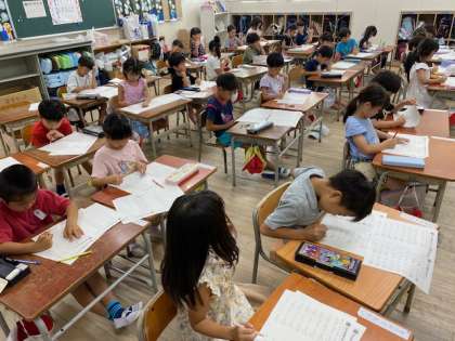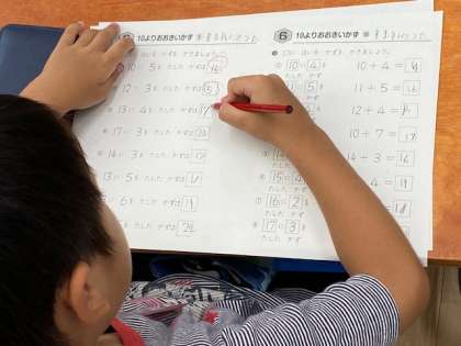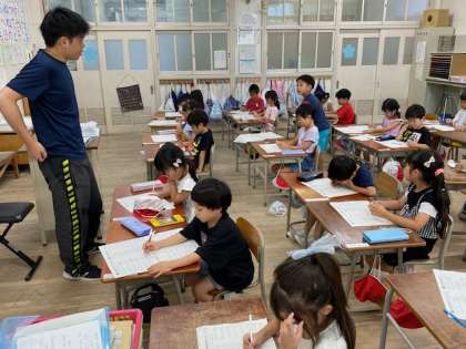 答え合わせがテキパキ進んでいて、1年生の成長ぶりを感じました。一方で、担任の先生は、遅れてしまう子にも目を光らせていました。