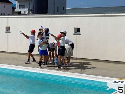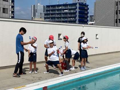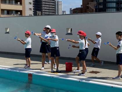 4年生の理科では、『閉じ込められた空気や水の学習』の終わりに、屋上プールで水道水を使って水鉄砲大会をしました。