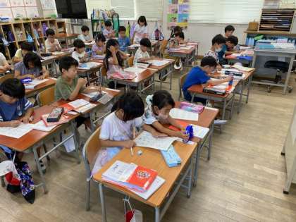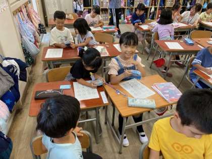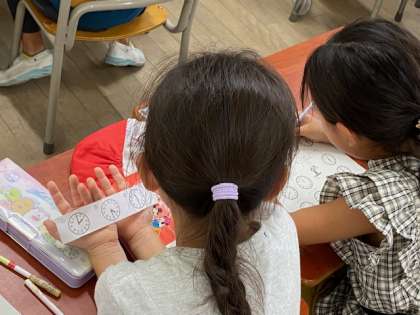 1年生の算数では、時計の練習問題に取り組んでいました。時計は慣れるまで時間がかかります。