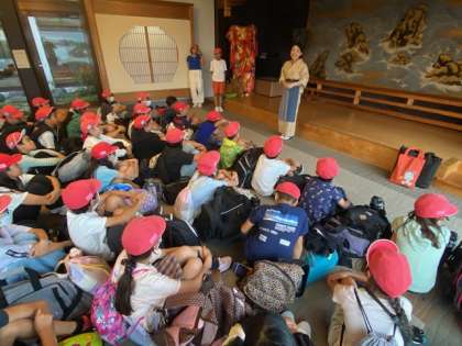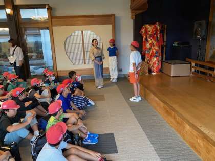 宿の方々から歓迎を受けた6年生は、早速、入舎式をしました。司会の子の進行で代表の子のあいさつがありました。