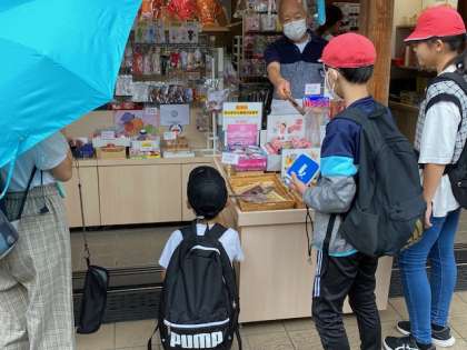 子どもたちは小雨の降るなか、買い物に出かけました。お店の前でお目当てのお土産とお小遣いの残高を見比べながら買い物を進めていました。