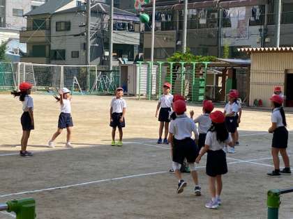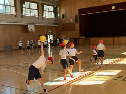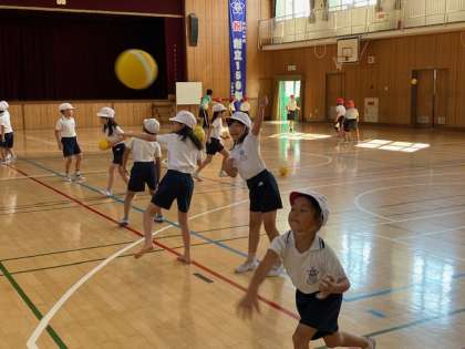 普段からボール遊びをしている子は慣れている様子でしたが、そうでない子はこのような授業を通して経験を積んでいきます。子どもたちはとても楽しそうでした(^^)