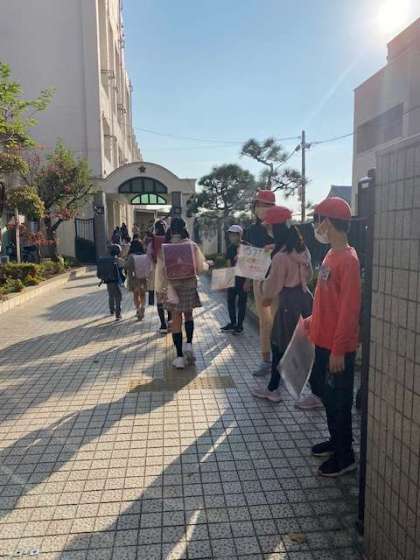 今日のあいさつ運動は、あいさつに加えて『ろうかかいだんは右側を歩こう!』と呼びかけていました。