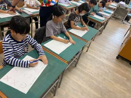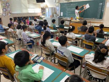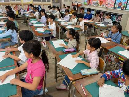 2年生の図工では、カッターナイフで紙を切ることにチャレンジしていました。ポイントは、カッターの刃の向きは変えずに紙を動かすこと。子どもたちは、先生の切り方に注視しながら、自分の紙も動かしていました。