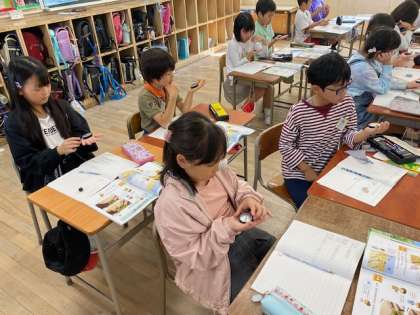 3年生の理科では、『なぜ かげの向きが変わったのか』という問いに対して予想を立てた後、方位磁石を使って調べていました。