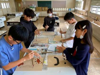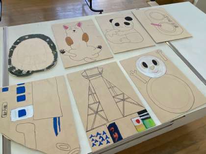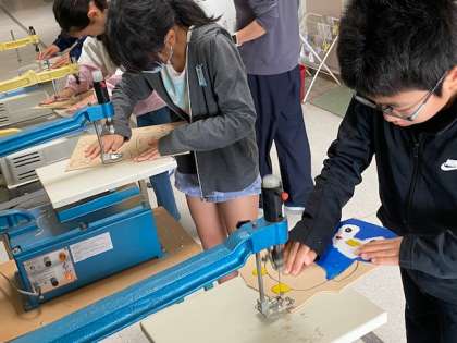 5年生の図工『使える伝言板』の製作も、いよいよ電ノコで切っていく段階に入っています。
