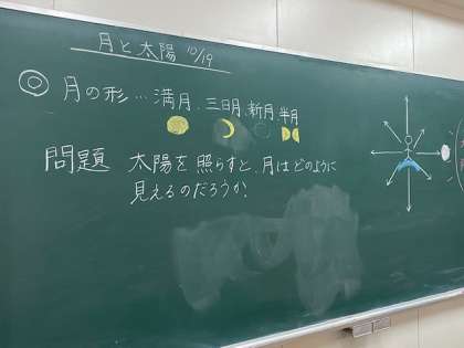 6年生の理科では、月と太陽の関係について学習をしています。今日は特に『太陽を照らすと月はどのように見えるのだろうか』というめあてで実験を行っていました。