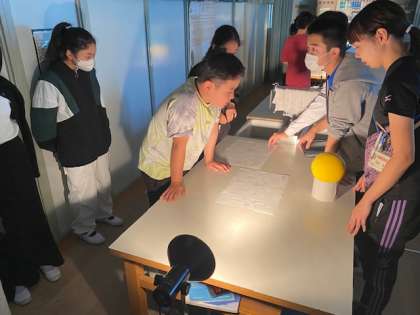 子どもたちは照らすライトを太陽、ボールを月として見立てて机に方角を書いて月の見え方を観察していました。