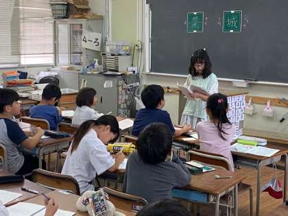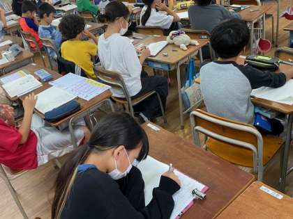 4年生の国語では、自分が考えて書いた物語を読んでいました。それを聞いている子は、良かったところ、もう少しこうしたら良いのではと思ったところをノートに書いていました。