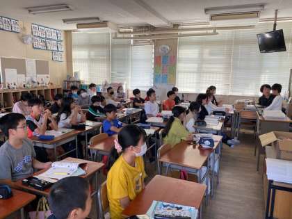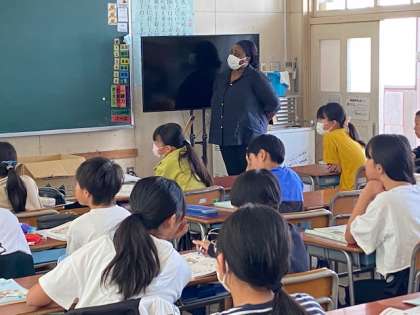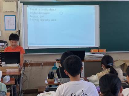 6年生の外国語活動では、この夏の思い出を綴ったプレゼンをみんなの前で紹介。発音についてはネイティブティーチャーが補ってくれていました。