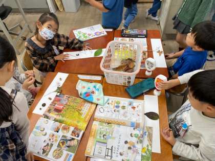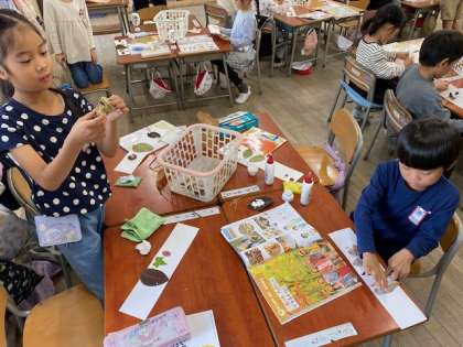 1年生の生活科では、『あきあそび』として『はっぱや みを つかって あそぼう』というめあてで活動していました。