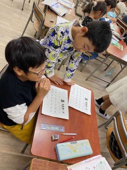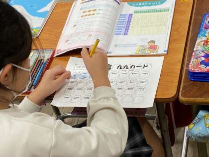今、2年生の算数では、九九の暗唱に取り組んでいます。先生の前で、スラスラつまらずに言えたら合格となります。合格したら九九カードの中の合格した段を塗ることができます。