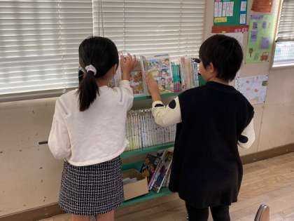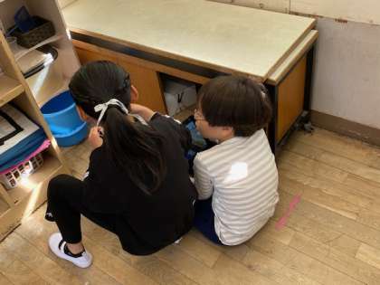これは、これから描く絵の構図を考えているところだそうです。配膳台の中や学級文庫の上など、ありえないシチュエーションに子どもたちの遊び心、豊かな発想を見た思いました(^^)