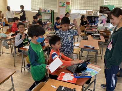 3年生の図工の時間をのぞいてみると、子どもたちは、自分の全身が写っている写真を切り抜いた人型を持って、教室や色々なところに置いているところでした。