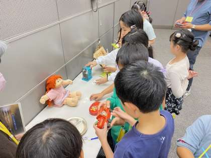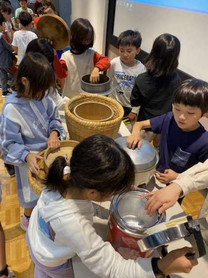 早速、60年〜100年ぐらい前の道具にふれて何をするための道具なのか、どのように使うのか、触って動かしていました。