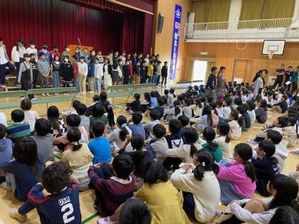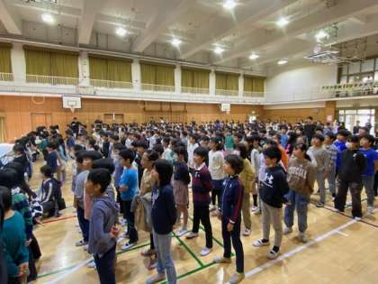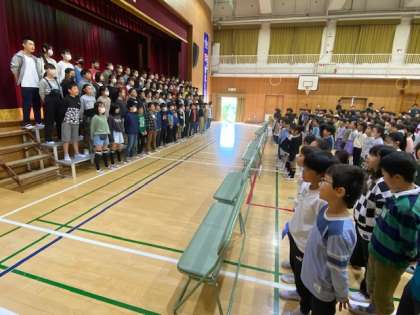 今日は11月11日に控えている学校創立150年記念式典の練習を全校児童で初めて行いました。